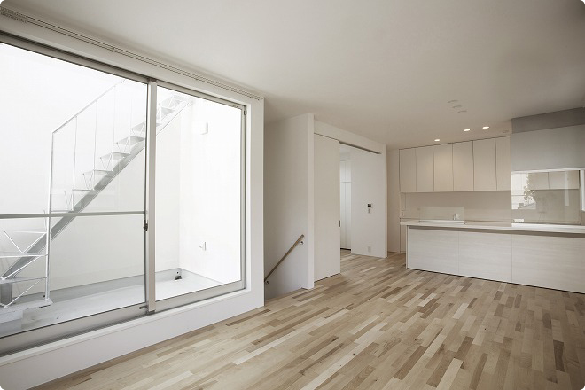 代官山の一角に建つ1戸の住宅と地下賃貸スペースからなる長屋の計画。 住宅密集地であることから1,2階の開放度は極力抑え、3階の専用テラスを設けたリビングは明るさと空への広がりが感じられる家の中心である。 また、このテラスと屋上のルーフテラスを連続させることで、屋上までも一体となった開放的な生活空間を創出している。