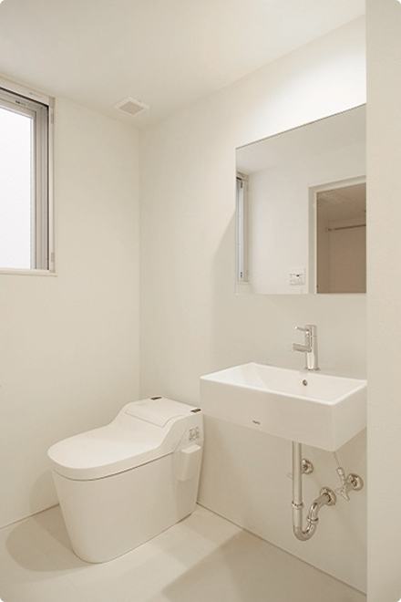住戸内は、玄関から水廻り・ウォークインなど密度の高い機能空間を抜け、通りに対して大きく開いたリビングに至る。