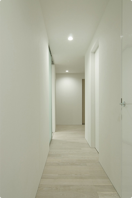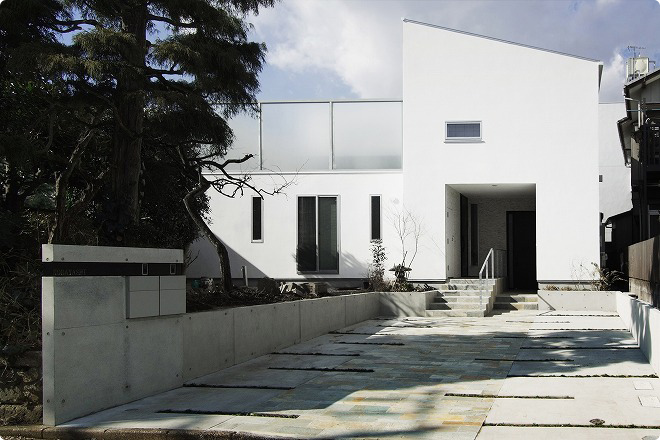 | 閑静な住宅街に建つ、1階親世帯・2階子世帯の二世帯住宅。 周辺に住宅が密集することから、1・2階各々に外に出ることができる各々の"中庭"を計画した。積層化されたコートハウスである。 各住戸が部屋の延長となる固有の外部空間をもち、その外部同士が一体化することで、各住戸は独立していてもお互いの距離感が近く感じられる。 また、居住時間の長いリビングは敢えて上下で重ねず斜向かいの配置とすることで、視線は通るが気にならない、気にはならないがお互いの様子はわかる、という関係を作っている。 周囲の住宅に対しては壁によるプライバシー保護、セキュリティを重視しつつ、2階テラスの南側=道路側は障子のような半透明ガラススクリーンとした。 テラスに自然光の明るさをもたらしつつ、道路側に対して住宅内の雰囲気を伝え、閉鎖的な印象を与えないようにしている。 周辺環境の向上に与することは町を形成している個々の住宅の役割・責任であり、その意識は結局のところその住宅の格として反映されてくるものと考えた結果である。