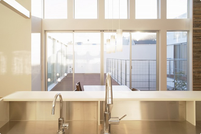 | 閑静な住宅街に建つ、1階親世帯・2階子世帯の二世帯住宅。 周辺に住宅が密集することから、1・2階各々に外に出ることができる各々の"中庭"を計画した。積層化されたコートハウスである。 各住戸が部屋の延長となる固有の外部空間をもち、その外部同士が一体化することで、各住戸は独立していてもお互いの距離感が近く感じられる。 また、居住時間の長いリビングは敢えて上下で重ねず斜向かいの配置とすることで、視線は通るが気にならない、気にはならないがお互いの様子はわかる、という関係を作っている。 周囲の住宅に対しては壁によるプライバシー保護、セキュリティを重視しつつ、2階テラスの南側=道路側は障子のような半透明ガラススクリーンとした。 テラスに自然光の明るさをもたらしつつ、道路側に対して住宅内の雰囲気を伝え、閉鎖的な印象を与えないようにしている。 周辺環境の向上に与することは町を形成している個々の住宅の役割・責任であり、その意識は結局のところその住宅の格として反映されてくるものと考えた結果である。