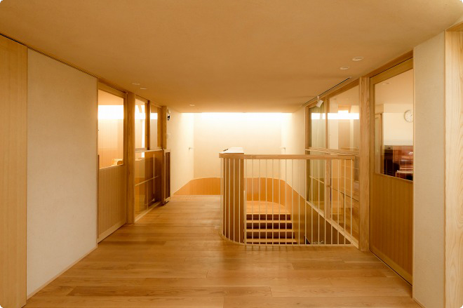 内部は、木と土による柔らかい雰囲気の仕上とした。ハイサイドからの包まれるような光と共に温かみの感じられる保育空間を創出している。