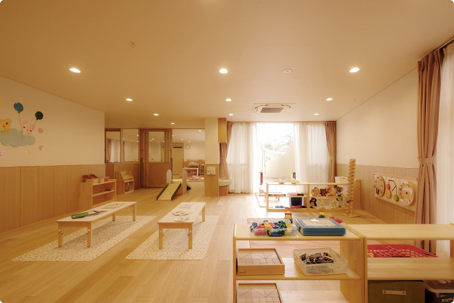 2階保育室。奥の壁面をハイサイドからの自然光が照らす。