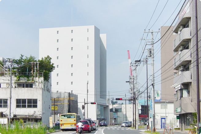 小田急線鶴川駅前に建つ賃貸32住戸、4店舗の複合ビル。