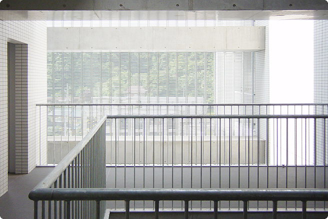 外部廊下の外装には有孔鋼板を採用、外からの視線を緩やかに遮りつつ、明るい中庭を演出しています。住戸は、大開口のある開放的で広めのワンルームです。